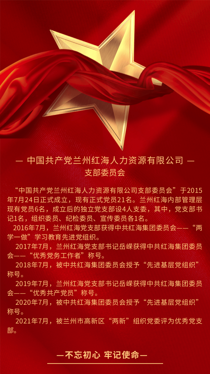 兰州红海人力资源有限公司党支部成立于2015年 ,现有正式党员24名,是高新区培树的标准化党建工作示范点。在高新区“两新”组织党委的领导下,充分发挥基层党组织的战斗堡垒作用,紧紧围绕“双强六好”支部建设目标,积极开展“三岗联创”和“三亮三比三争创”活动,深入开展党员党性教育,积极组织党员参与社会实践活动,引导党员及其他员工牢固树立正确的人生观、世界观、价值观。